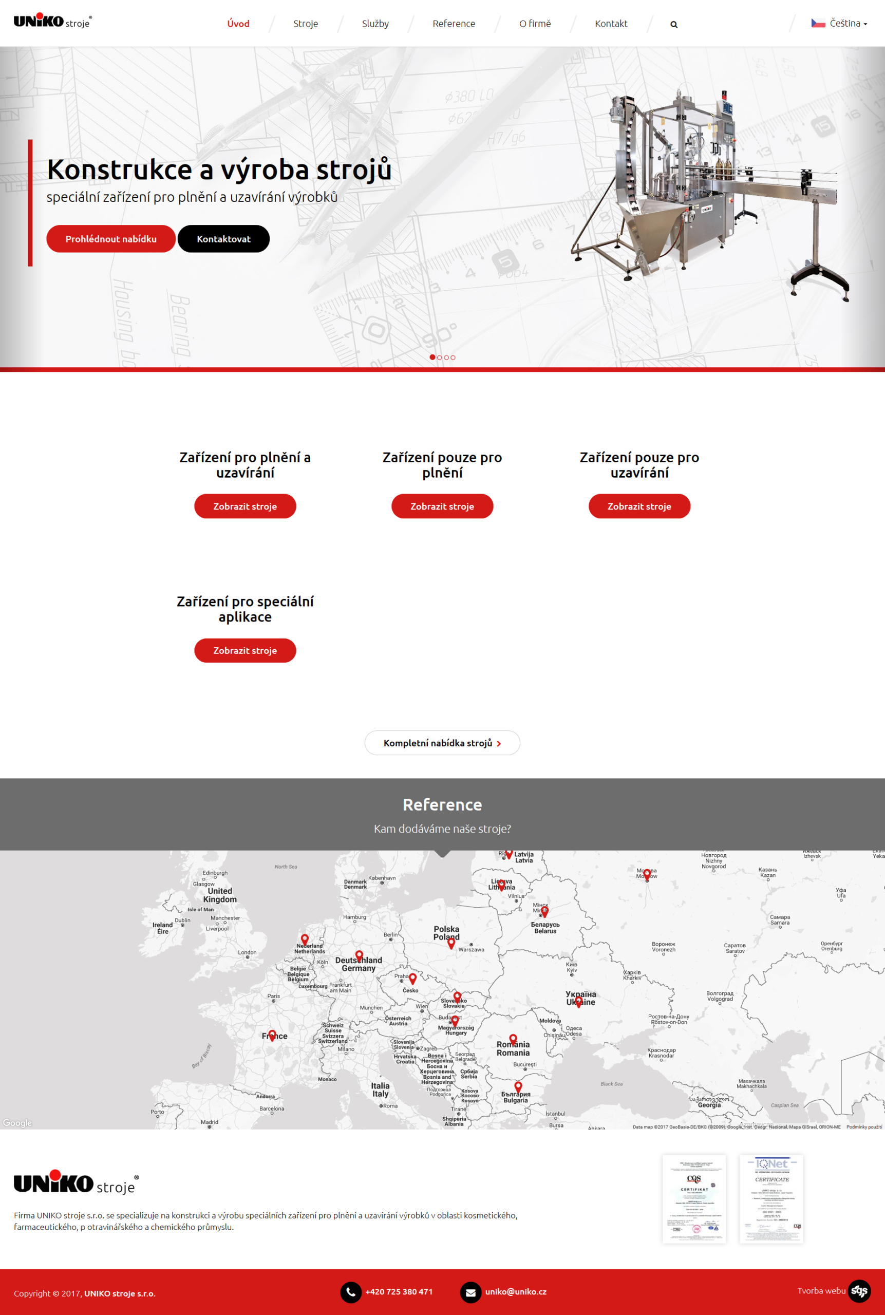 Klient se specializuje na konstrukci a výrobu speciálních zařízení pro plnění a uzavírání výrobků, což bylo potřeba jasně sdělit návštěvníkům. Právě technický styl jsme proto zohlednili a zakomponovali při tvorbě grafického návrhu pro redesign nového responzivního webu. Barevnost stránek vychází z loga a firemního stylu zadavatele. Celý projekt je spuštěn na redakčním systému WordPress, aby si klient byl schopen snadno editovat obsah.